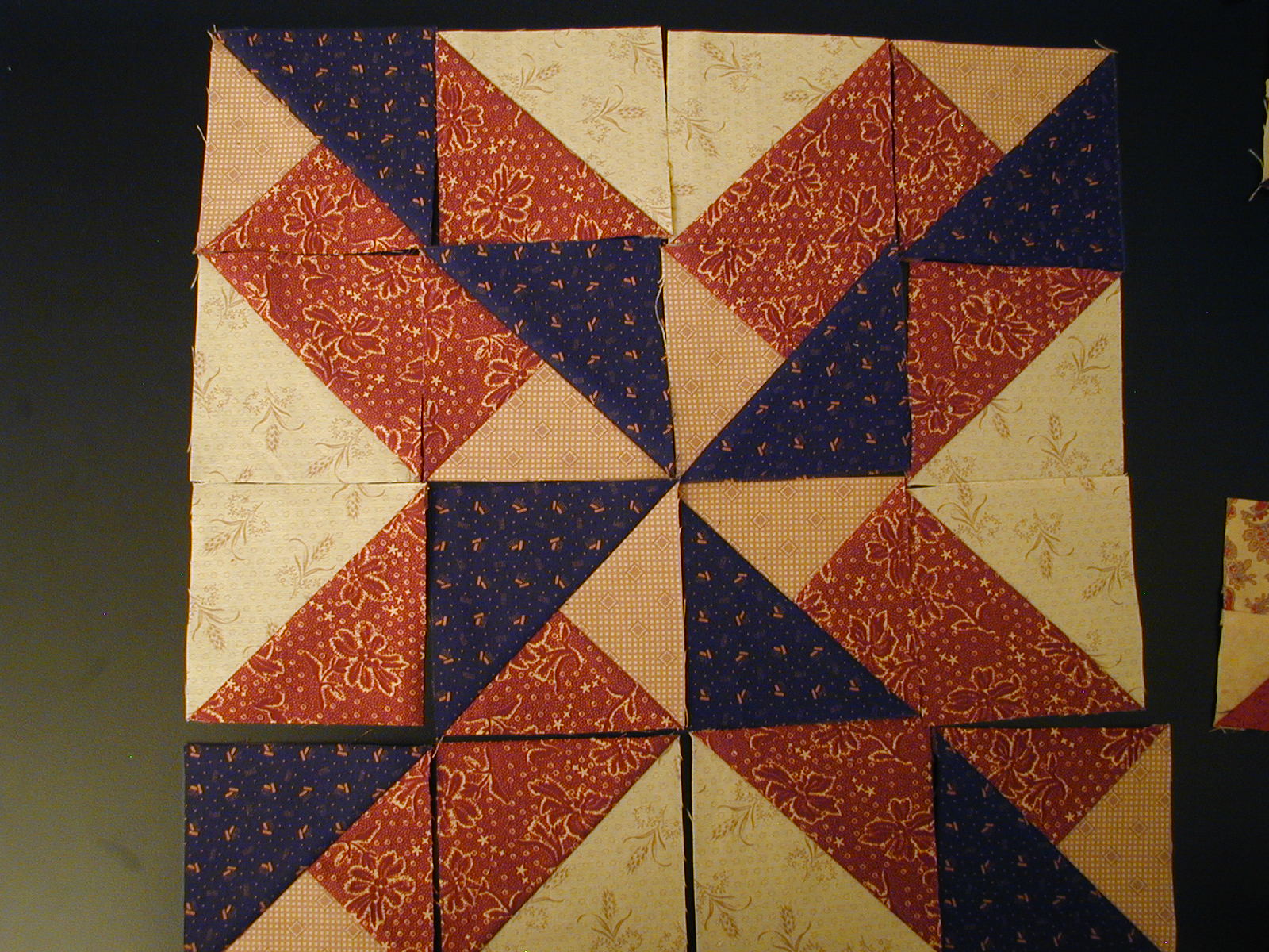 Last night I finished squaring lots of HSTs prepping for the setting triangles that will be added next. My Patchwork Math book came in handy to make them 8 at a time! That was a breeze and they went together so much faster. Yea! Now to sew them together, this evening if I find the energy. Below is a graphic of the original pattern...